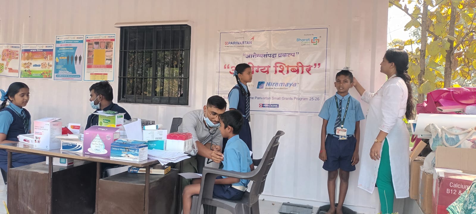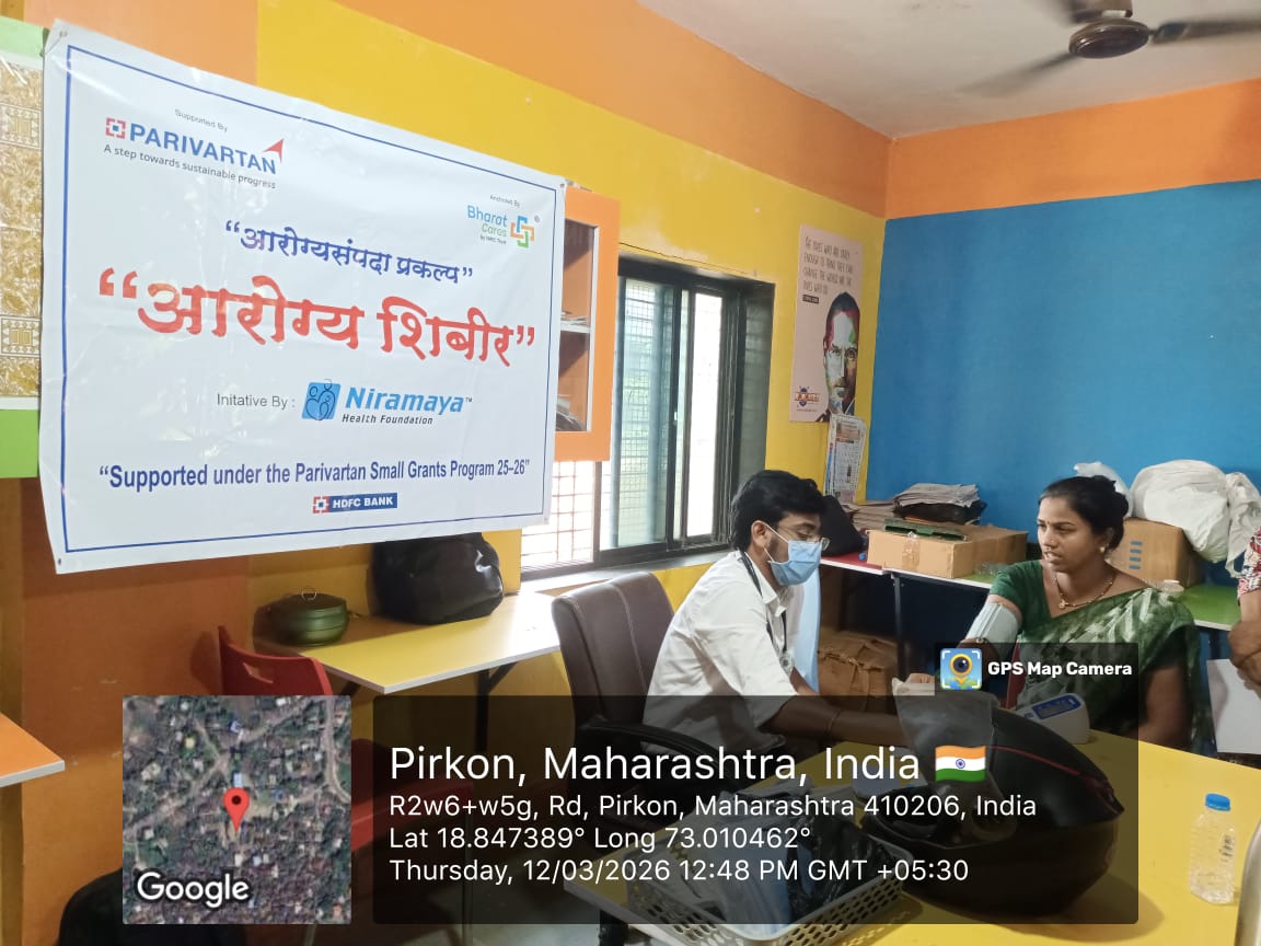 Niramaya Health Foundation, with support from Parivartan Bharat, BharatCares, and HDFC Bank, implemented the AarogyaSampada Project to improve access to primary healthcare services in selected villages of the Uran region near JNPT. The project addressed limited healthcare facilities, high treatment costs, and delayed care-seeking among underserved communities. Four village-based mega health camps were conducted in Punade, Sarade, Pirkon, and Chirner villages, covering 419 villagers with general check-ups, nutritional screening, eye check-ups, BMD screening, basic diagnostic tests, and medicine support.